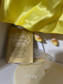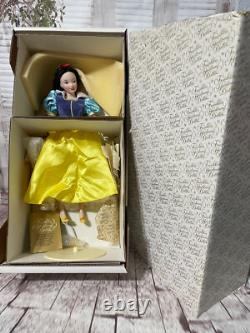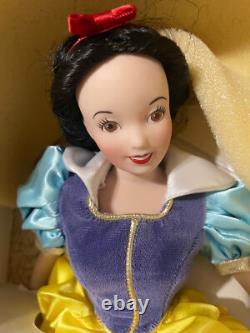 Franklin Mint and Walt Disney Collaboration Snow White porcelain doll in mint condition. Dress's skirt is a bit wrinkly from storage but in perfect condition with tags and box and stand for display.